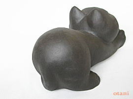 伸ばしアクビをする猫姿、まるで笑っているかの置物になりました。